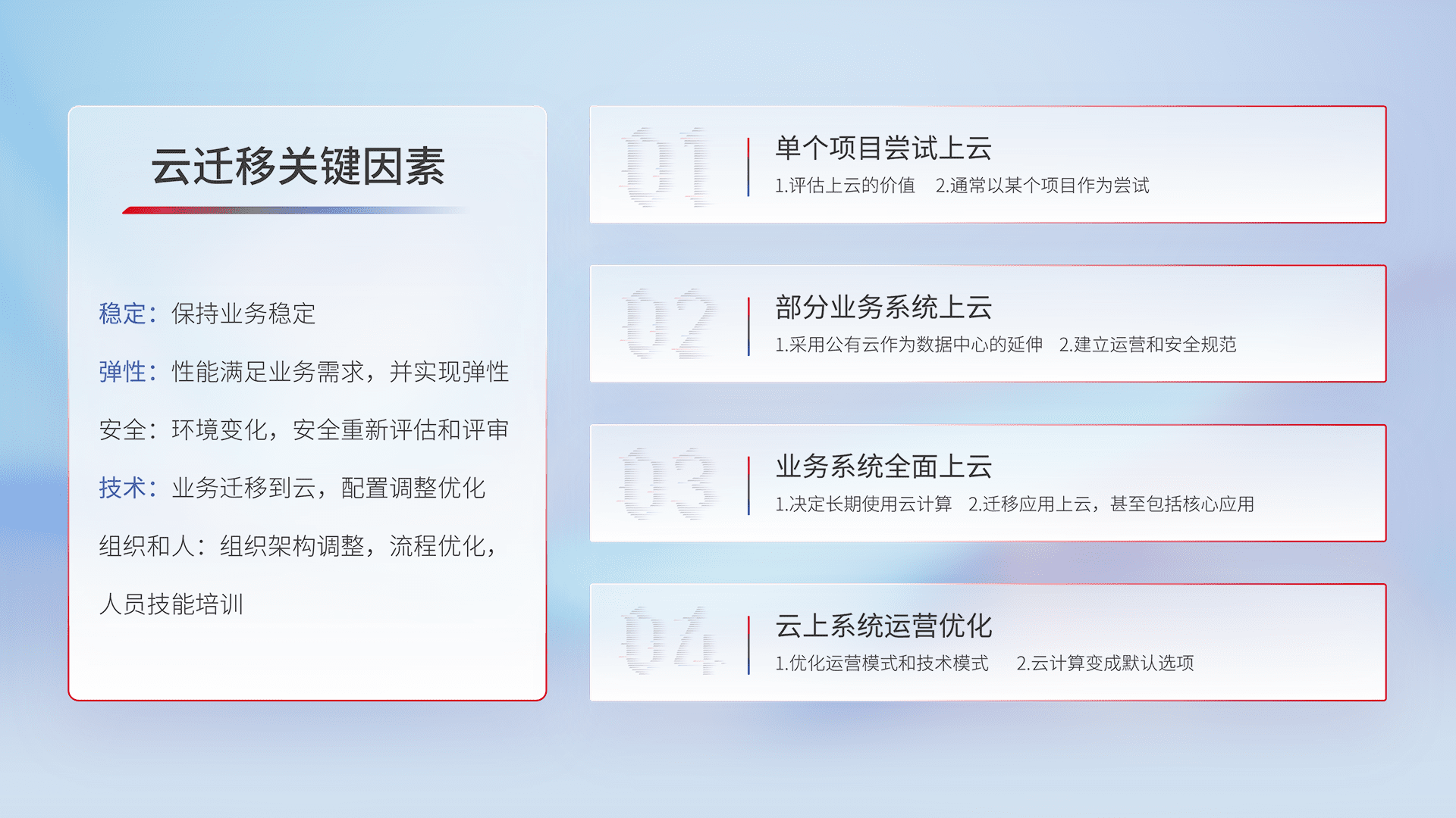 结合实际业务,,,,从规划设计、、、、云平台选型、、、、云原生改造、、、、数据迁移、、、、集成交付,,,迁移全过程为客户识别最佳上云路径,,,,做好风险识别管理,,,设计网络架构、、、、身份权限、、安全审计合规、、操作审计、、、、日志审计、、监控告警策略、、、多站点容灾设计等,,对云上基础设施进行整体规划,,提升IT治理水平,,,以满足弹性、、高可用、、、高性能的需求。。